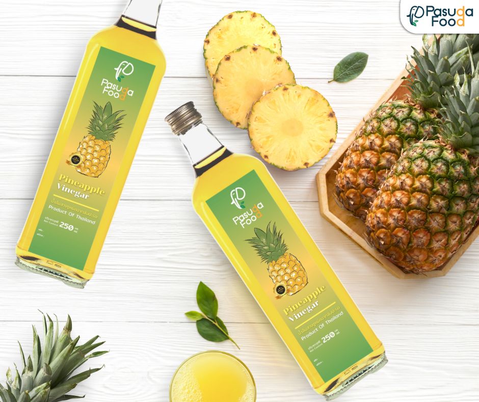สับปะรดของประเทศไทย มีความเป็นเอกลักษณ์ หอม หวาน ฉ่ำ เหมาะแก่การนำมาทำน้ำส้มสายชู จึงทำให้น้ำส้มสายชูหมักมีรสชาตินุ่มนวล